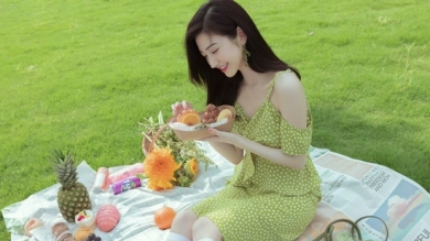 景甜野餐氛围感大片曝光 身穿绿色波点吊带裙清新甜美