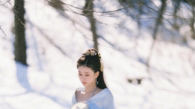 照片中的她,身穿水蓝色古风长裙,手持团扇,低眉浅笑,仙气十足