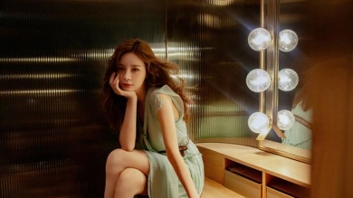 沈梦辰微卷长发配薄荷绿连衣裙 复古温柔大秀美腿